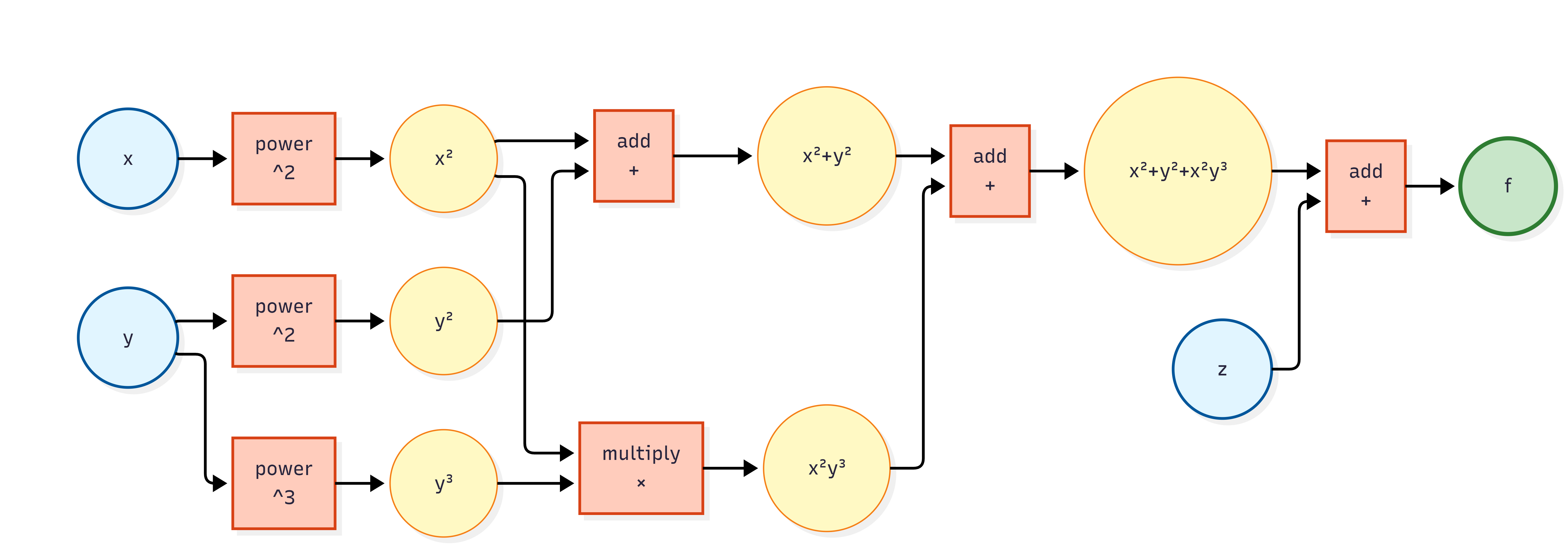 这非常好理解. 对于计算机来说, 我们使用面向对象的方式, 只需要实现 Node 类, 随后继承出 Variable 类和 Operation 类即可表示计算图. 我们可以使用指针方法来表示节点之间的依赖关系.